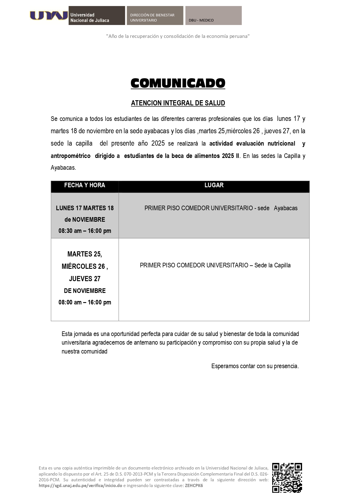 Esta actividad es de vital importancia ya que tiene como objetivo promover el bienestar y la salud de todos los estudiantes, permitiendo conocer y mejorar su estado nutricional para asegurar que esta parte fundamental de la comunidad educativa pueda mantener un rendimiento óptimo y prevenir problemas de salud. Actividad a desarrollarse según el siguiente detalle: